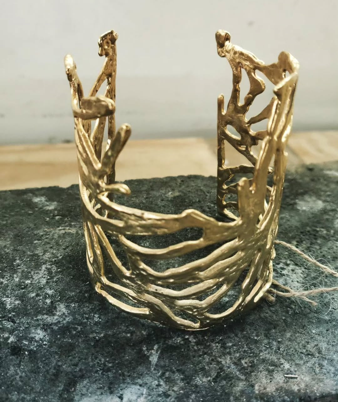 Brazalete forjado en bronce con baño de oro, inspirado en las formas orgánics y ancestrales de la naturaleza.